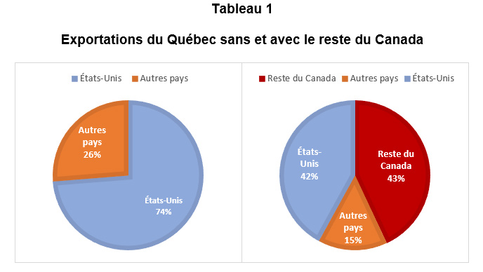 Cependant, cette manière de présenter les chiffres donne une vision biaisée de la réalité. En omettant les échanges entre le Québec et les autres provinces canadiennes, on surestime la dépendance du Québec à l’économie américaine.